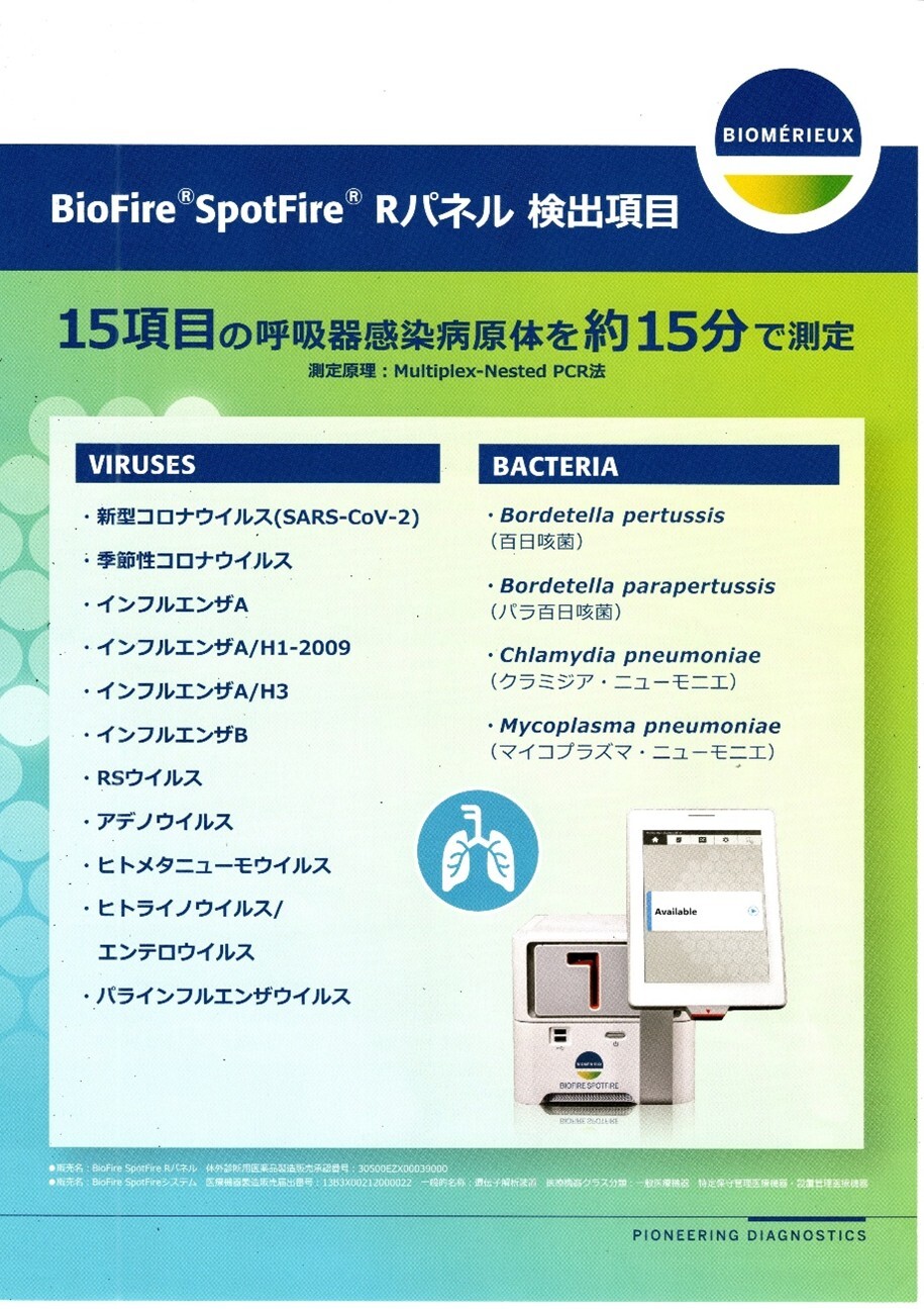 1回の鼻咽頭ぬぐいのPCR検査で、同時に15種類(ウイルス11種類・細菌4種類)の検査が可能な「BioFire SpotFire Rパネル」を導入致しました。